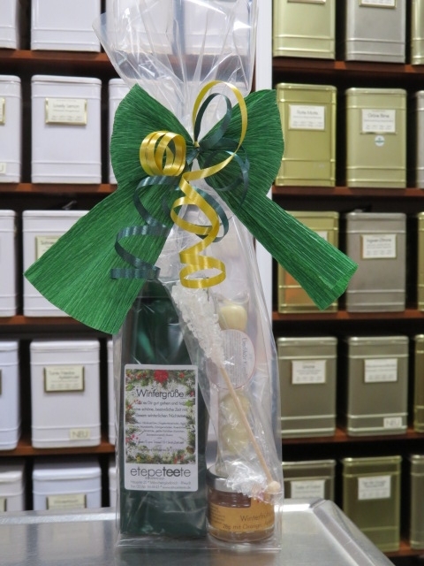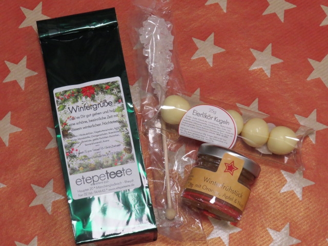 Zutaten: Apfelstücke, Hibiskusblüten, Hagebuttenschalen, Orangenschalen, Mandelstücke, Rosenblüten, Nelken, Zimtstücke, geölte Korinthen (Korinthen, Sonnenblumenöl), Aroma