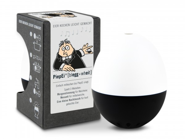 Mit der bewährten Funktion für drei Härtegrade funktioniert das PiepEi® [blegg+wheit] wie alle anderen Editionen. Einfach mit den echten Eiern lagern, zusammen kochen, warten bis die passende Melodie kommt, herausnehmen, abschrecken – und nur die echten Eier essen.