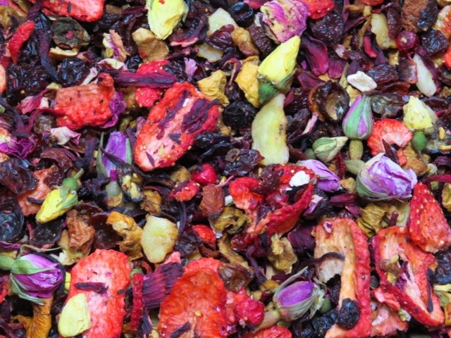 Doch daneben findet man im Früchtetee fast jede Obstsorte: Äpfel, rote und schwarze Johannisbeeren, Erdbeeren, Orangenschalen, Heidelbeeren, Kirschen und Mangos etc.p.p...