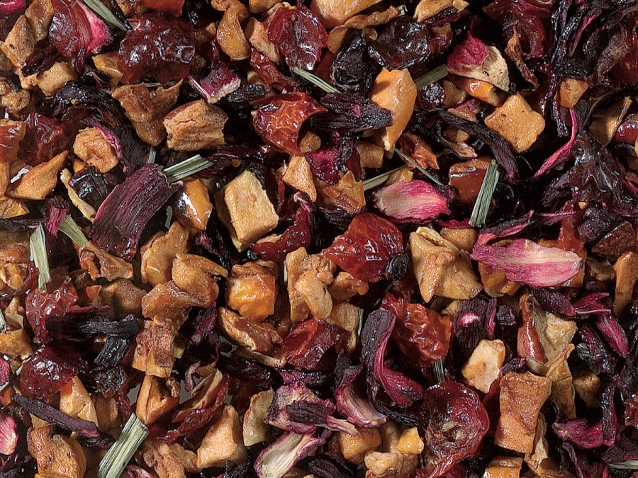 Zutaten: Apfelstücke, Hibiskusblüten, Hagebuttenschalen, natürliches Zitronenaroma mit anderen natürlichen Aromen, Zitronenschalen, Zitronengras