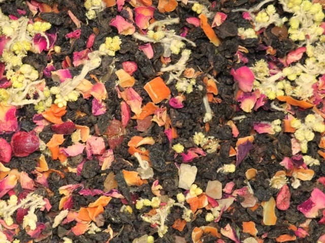 Zutaten: Oolong Tee, Karottenstücke, kandierte Ananasstücke (Ananas, Zucker), kandierte Papayastücke (Papaya, Zucker), natürliches Aroma, Süßkraut, Katzenpfötchenblüten, Rosenblütenblätter, Cranberrystücke, Lycheestücke